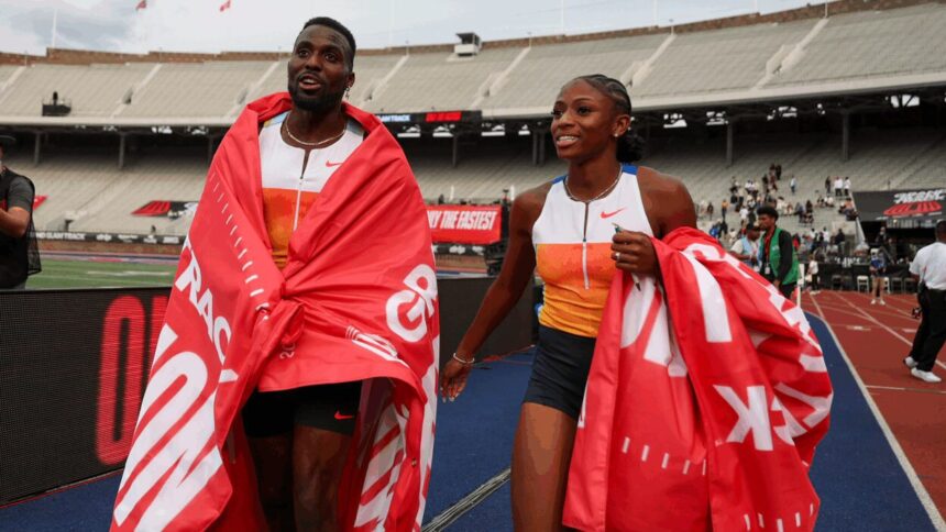 The final day of competition (June 1) at the third Grand Slam Track meet in Philadelphia concluded with explosive performances in the men and women’s 100m, held at Franklin Field at the University of Pennsylvania. Both Melissa Jefferson-Wooden and Kenny Bednarek delivered new personal bests and world leads in their events.